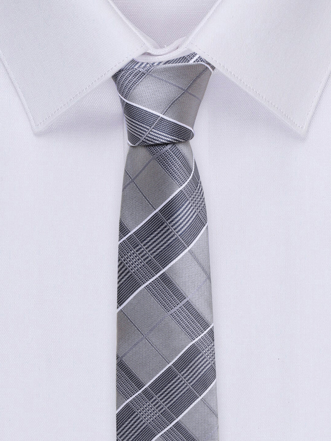 Checkered Grey Italian Silk Necktie Set Pocket Square Chrome Tiepin cufflinks and Brooch