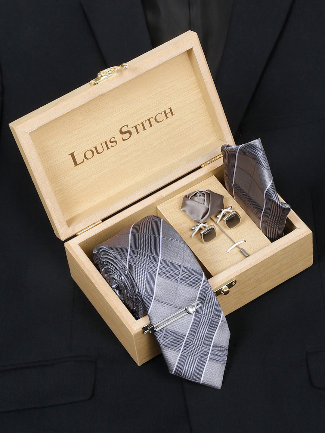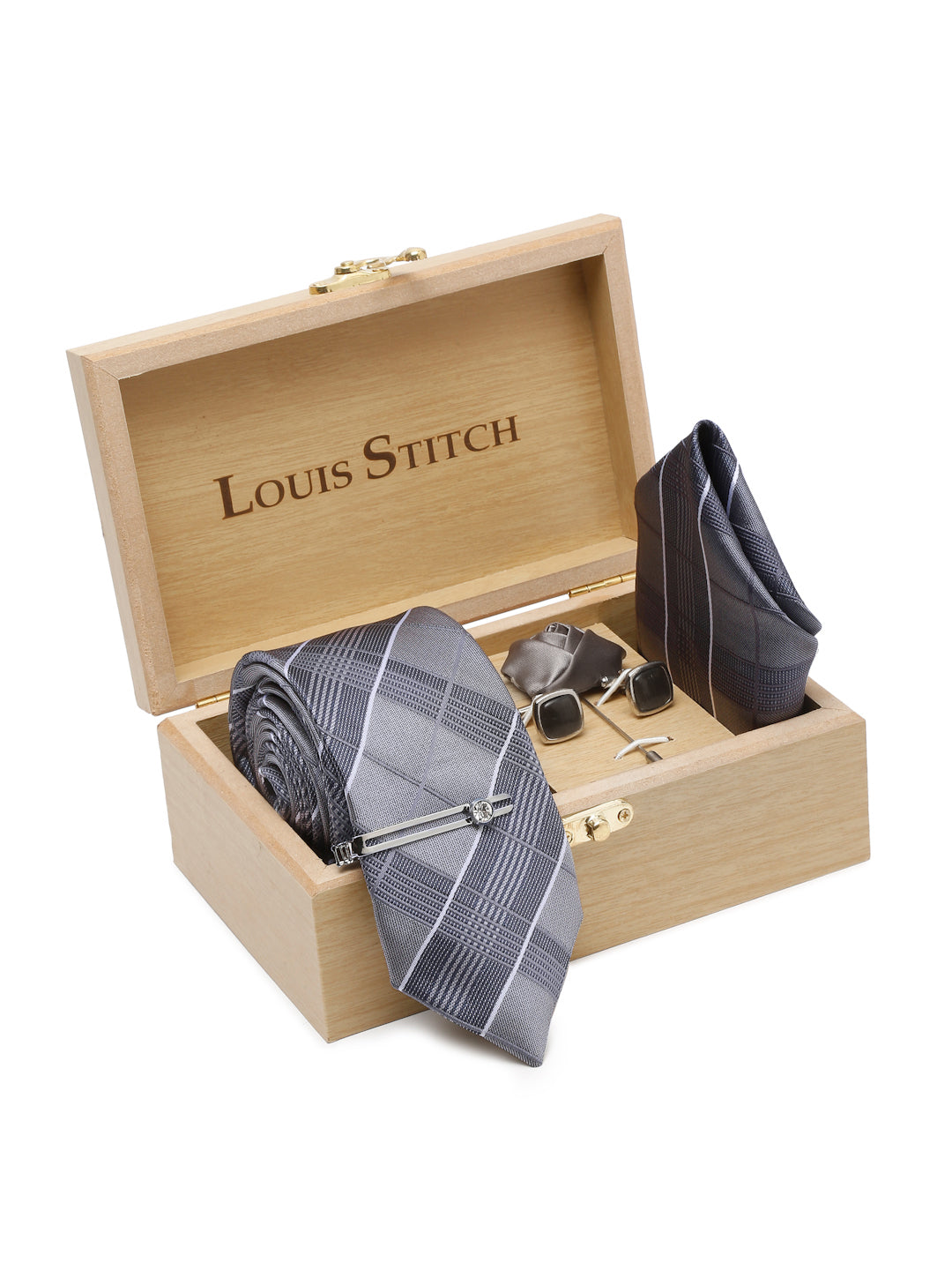 - Package includes: Necktie with Pocket Square, Chrome Tiepin, Brooch, Cufflinks and Signature Brand Box