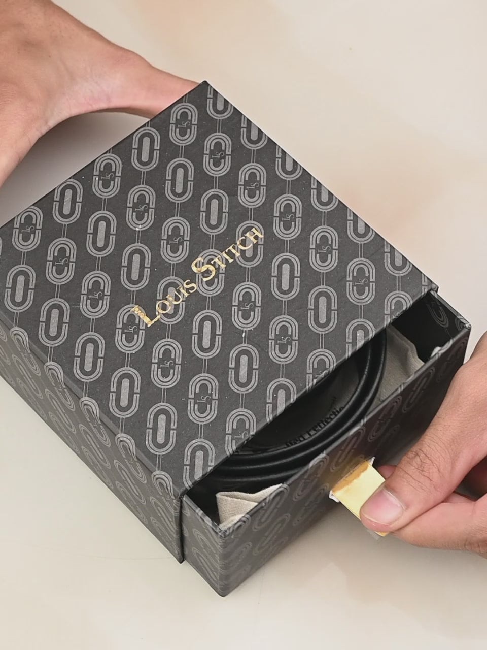 Louis Stitch's signature packaging, elegantly designed in Black, is wrapped with a refined golden and black ribbon. Please note, images are for representation purposes only