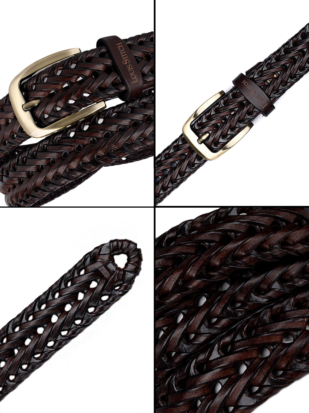 Men's Weaved Leather Belt Casual Belts for Men Spanish Leather Brass Buckle 1.5 Inch (35mm)