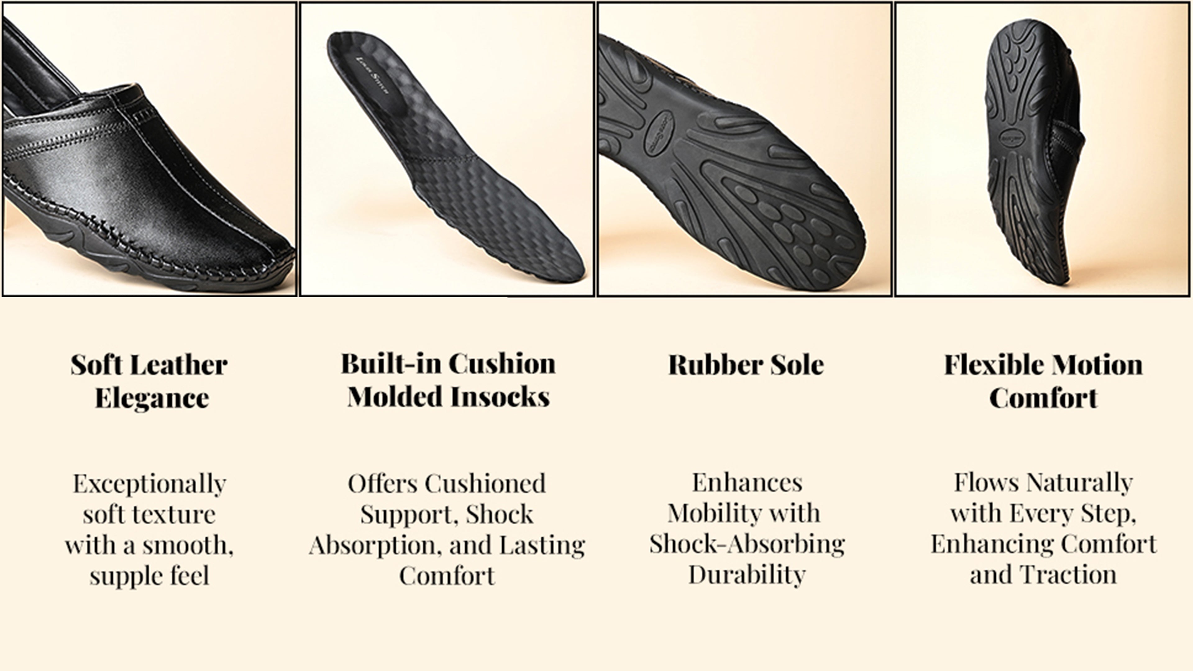 - Rubber Sole for Excellent Grip: These stylish black jutis for men feature a rubber sole, providing contemporary comfort, enhanced flexibility, and superior foot support for effortless movement.
