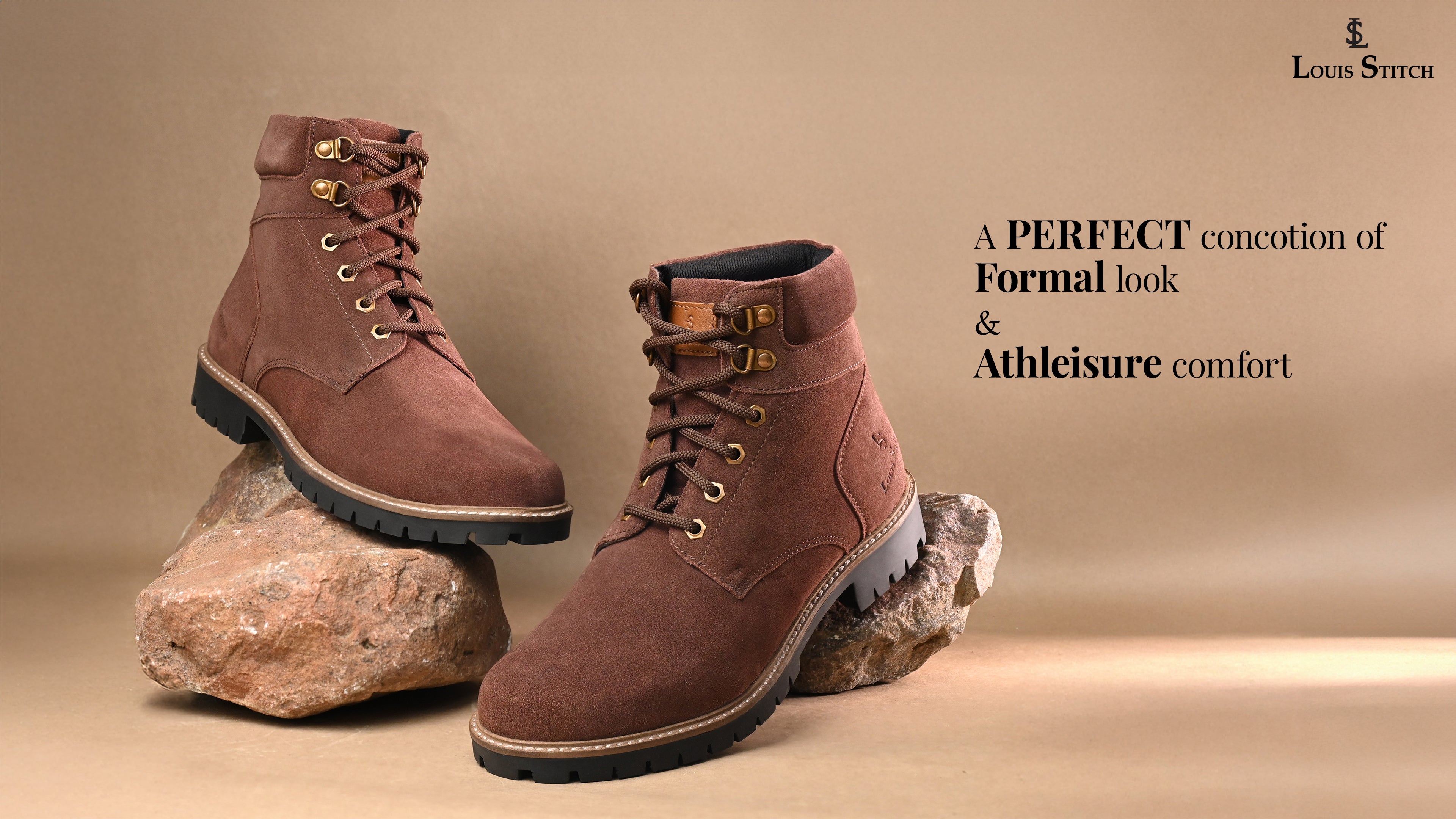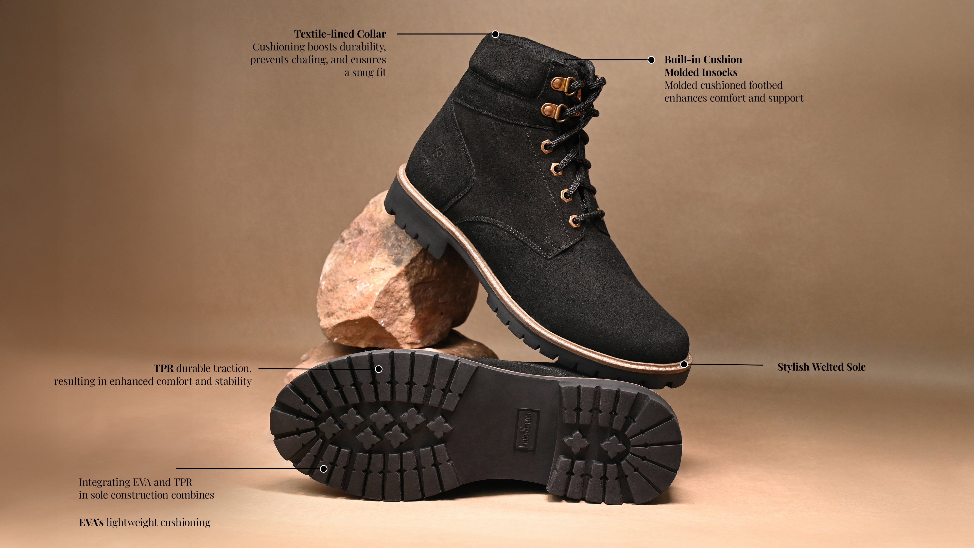 The LOUIS STITCH collection of men's boots features High Ankle Chukka Boots, designed for both functionality and a luxurious appearance. These lace-up boots are crafted for a comfortable fit during tough trips, featuring an anti-slip TPR sole for exceptional grip on rugged trails and solid support for biking on scenic roads.