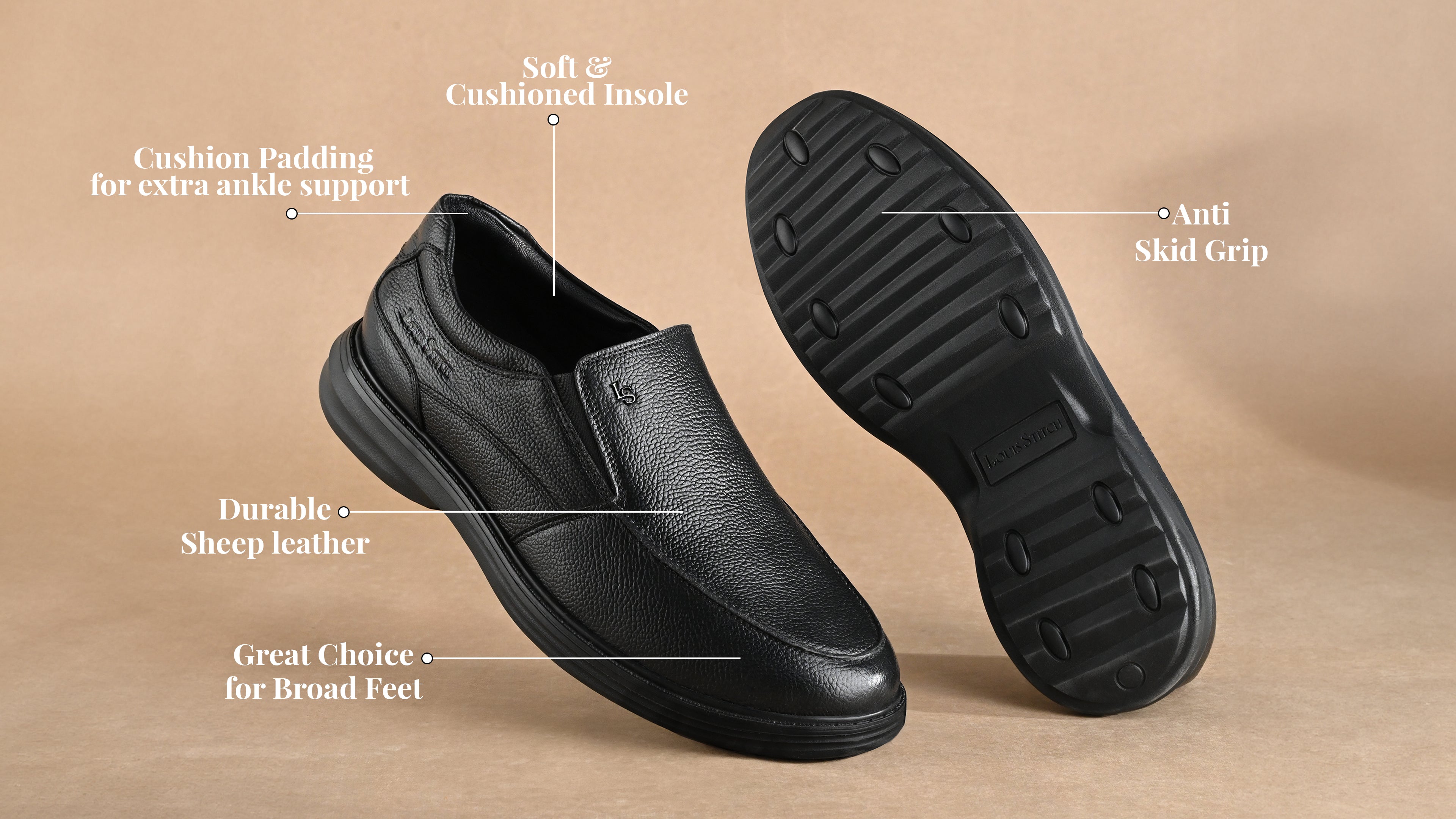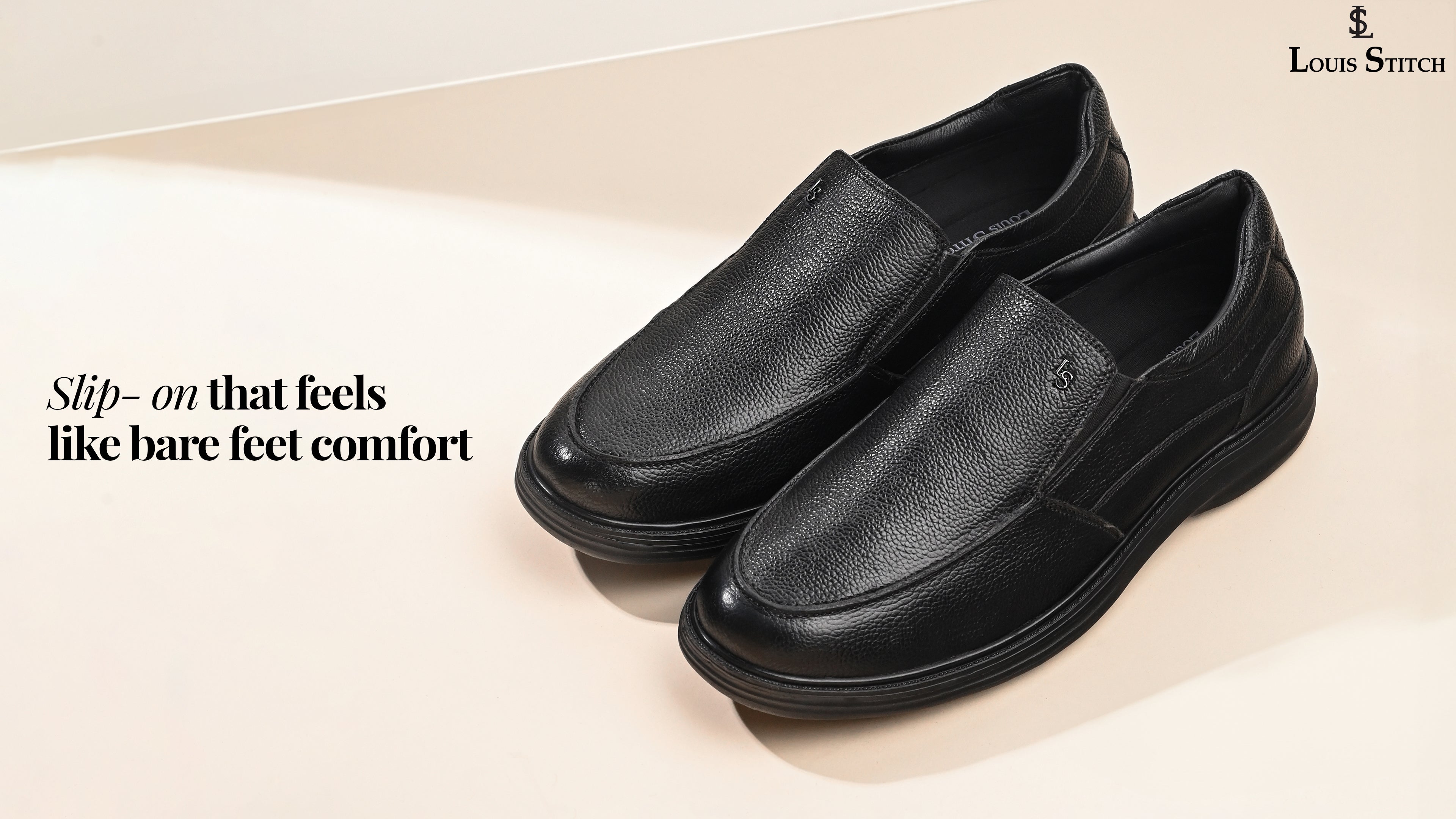 The LOUIS STITCH Introduces Exclusive Comfort Collection. Leather slip-ons casual shoes, featuring a sleek, lace-free design for effortless wear and all-day comfort. Designed with a lightweight EVA sole and cushioned insoles and padded ankle cushion, these shoes provide exceptional support and comfort, even during long hours of standing or walking. These casual slip-on shoes are perfect for an active lifestyle, offering effortless convenience for travel, work, and everyday wear. These leather shoes seamlessly enhance any outfit, from Stylish Office formal shoes to smart-casual. Pair them with jeans and a t-shirt for a laid-back look or with trousers and a shirt for a sophisticated edge. For a polished office ensemble, style them with a well-fitted polo and tailored trousers, making them a versatile choice for any occasion.