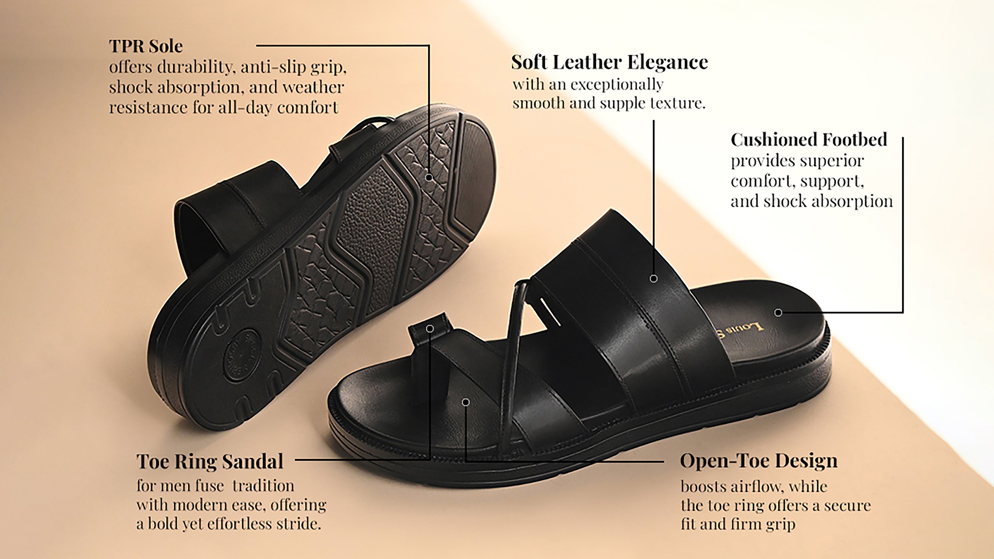 - The LOUIS STITCH Exclusive Collection of Men's Open Footwear presents this open toe leather sandal, crafted with a TPR sole to deliver exceptional comfort and style.