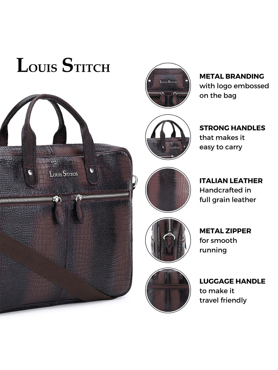 Elevate your professional style with the LOUIS STITCH Men’s Italian Leather Laptop Bag. Crafted from Premium Italian leather, this sophisticated men’s leather laptop bag features a distinctive Dual Tone and an Stylish Look. Seamlessly blends elegance with functionality. The spacious interior is lined with a Textile featuring the LS Signature, ensuring both durability and a touch of Opulence. Perfectly suited for the modern professional, it includes a convenient Front Open Chain Pocket for quick access to essentials. With its stylish LOUIS STITCH Nickle and Lead Free Chain and adjustable Shoulder Strap. This versatile Office Bag is ideal for both business and casual meetings.