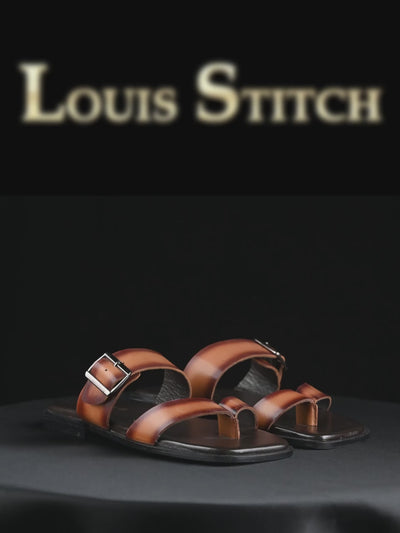 - The LOUIS STITCH Exclusive Collection of Men's Open Footwear presents this open toe leather sandal, crafted with a tunit welted sole and comfortable cushion to deliver exceptional comfort and style.