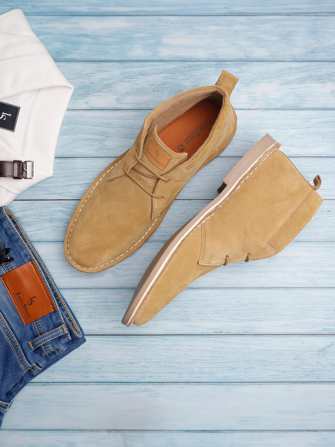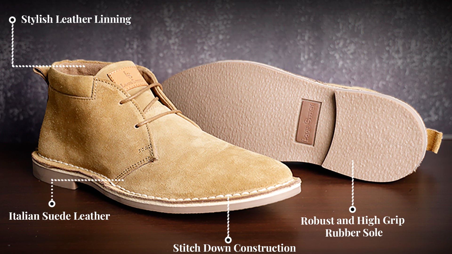 This is one of our most elegant option for Desert Boots. It is a high-quality Rubber sole. This sole is stamped with the Louis Stitch logo, and an Stitched Down Construction around the outsole and the outer borders. Our Rubber soles are Super Silent, made with norms passed high quality material only.