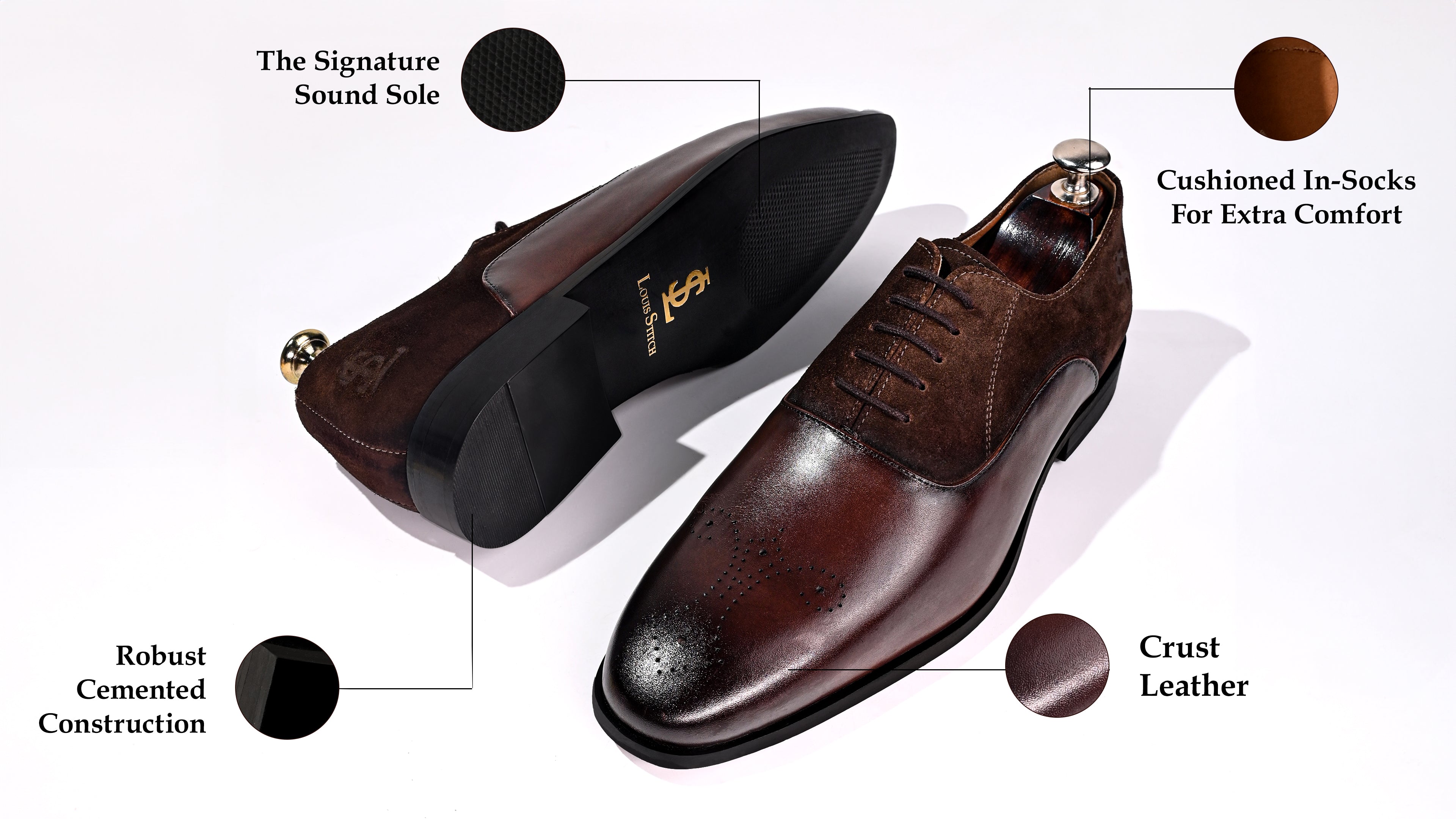 The LOUIS STITCH Exclusive Collection of Men’s Formal Shoes combines cushion comfort with contemporary design, making them ideal for both formal and business wear. Designed with a Crust Leather and Suede and PU lining, these shoes deliver breathability, flexibility, and a comfort fit. The Tunit sole ensures durability with a modern aesthetic. Built with cemented construction and the iconic LS branding, these Brogue Shoes for men provide long-lasting wear and versatile style. Whether for business, travel or outings, they perfectly balance performance with elegance. For the man who chooses LOUIS STITCH — Walk Bold. Live Brave. Go Beyond.