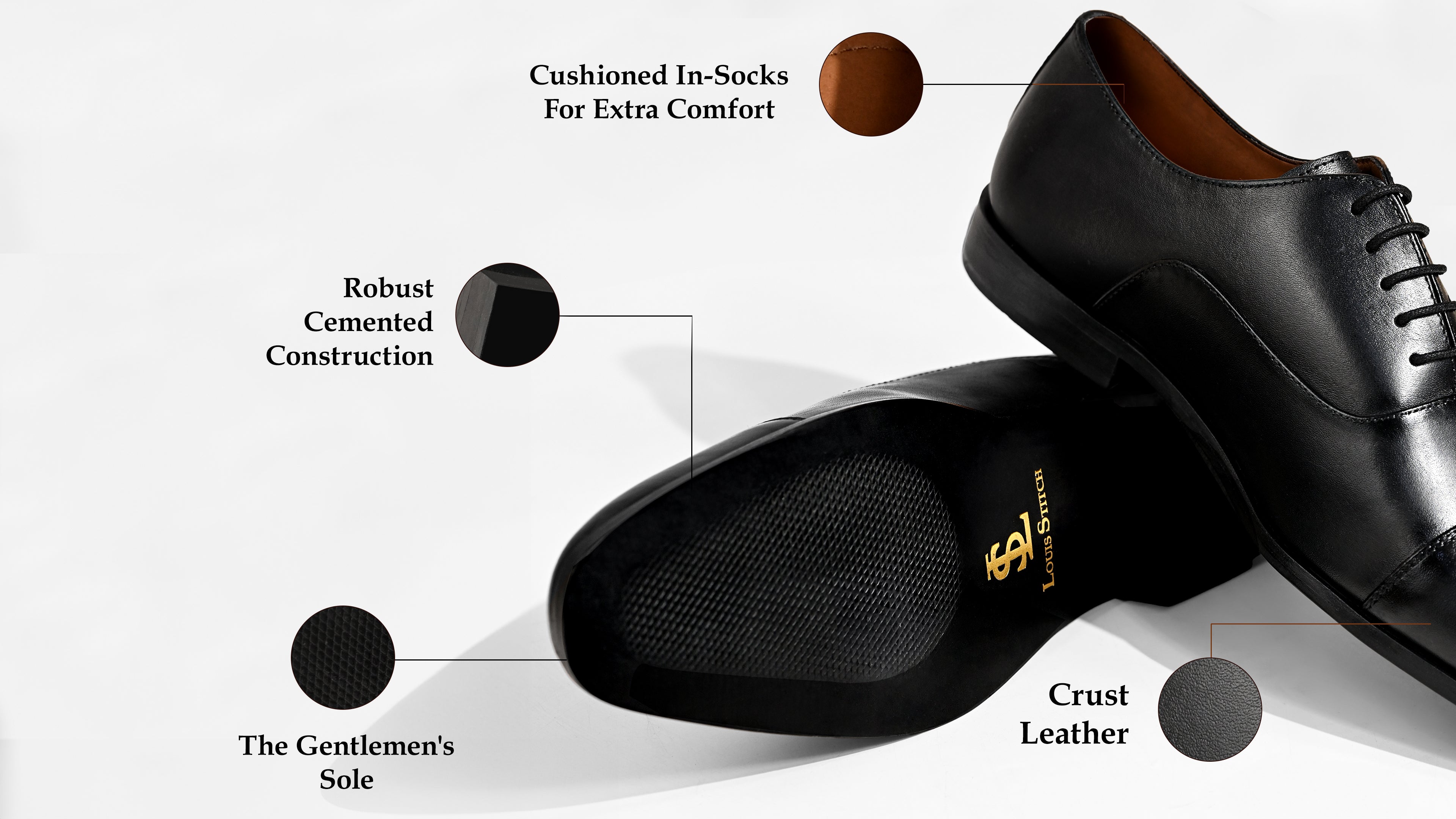 The LOUIS STITCH Exclusive Collection of Men’s Formal Shoes combines cushion comfort with contemporary design, making them ideal for both formal and business wear. Designed with a Crust Leather and PU lining, these shoes deliver breathability, flexibility, and a comfort fit. The Tunit sole ensures durability with a modern aesthetic. Built with cemented construction and the iconic LS branding, these Derby Shoes for men provide long-lasting wear and versatile style. Whether for business, travel or outings, they perfectly balance performance with elegance.