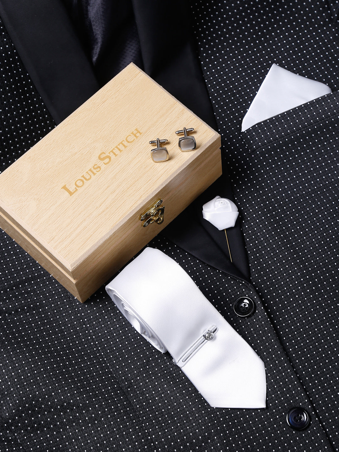 Indulge in the opulence of the LOUIS STITCH Silk Necktie Gift Combo Set, an exquisite accessory collection designed for men who crave sophistication and finesse in their fashion choices. Meticulously crafted from premium-quality silk, this necktie boasts a luxuriously soft and silky texture with a dazzling sheen that exudes elegance and class.This gift combo set transcends ordinary accessories by encompassing not just a necktie, but also a matching pocket square, cufflinks, and a brooch tie, creating a harmonious and well-coordinated ensemble that is sure to impress. The pocket square features the same sumptuous silk as the necktie, adorned with a complementary pattern that perfectly complements the tie's design.The cufflinks and brooch tie are fashioned from robust and durable materials, ensuring long-lasting wear that endures the test of time. Presented in an elegantly designed gift box, this gift combo set is the epitome of luxury, making it a perfect choice