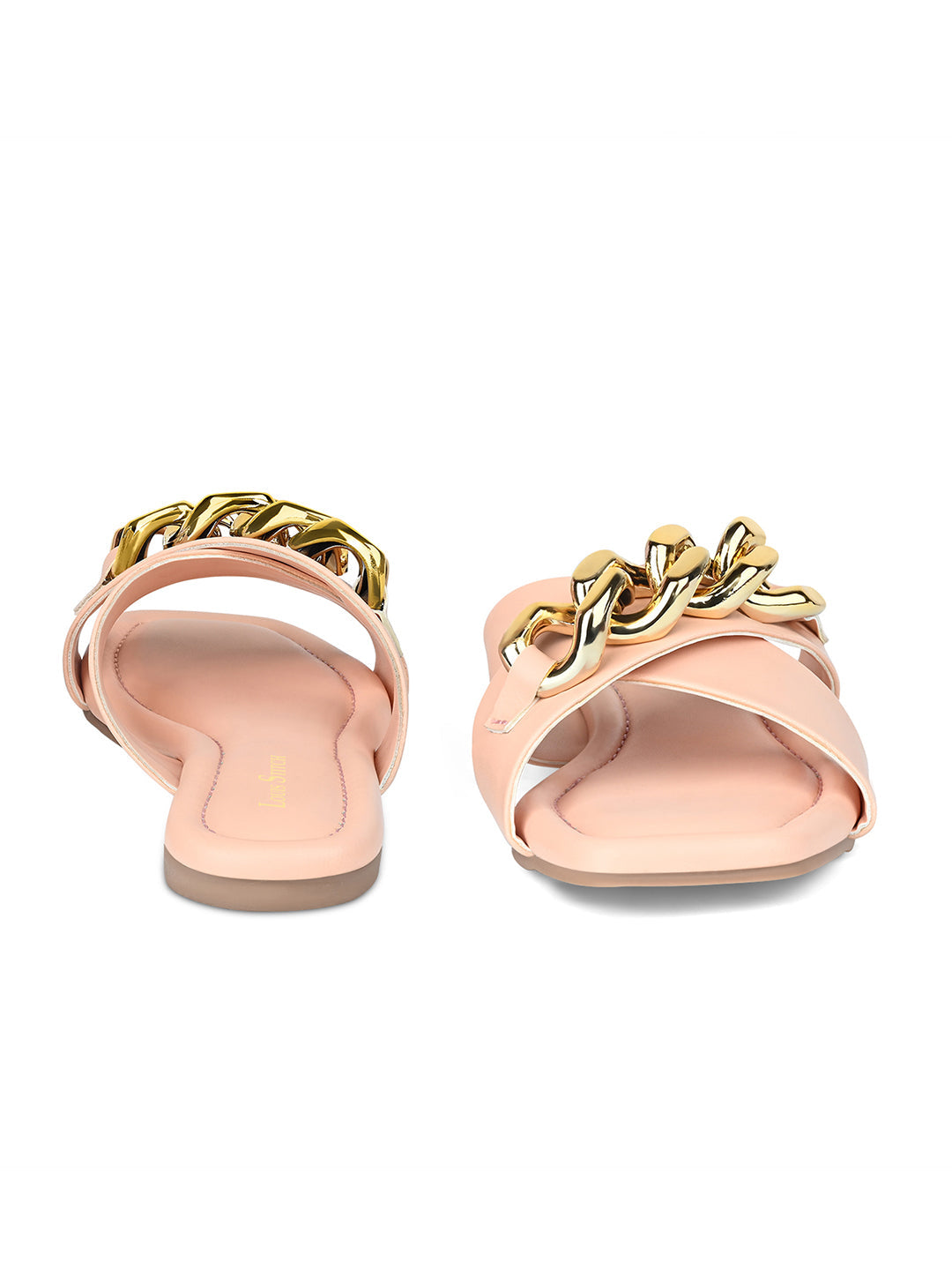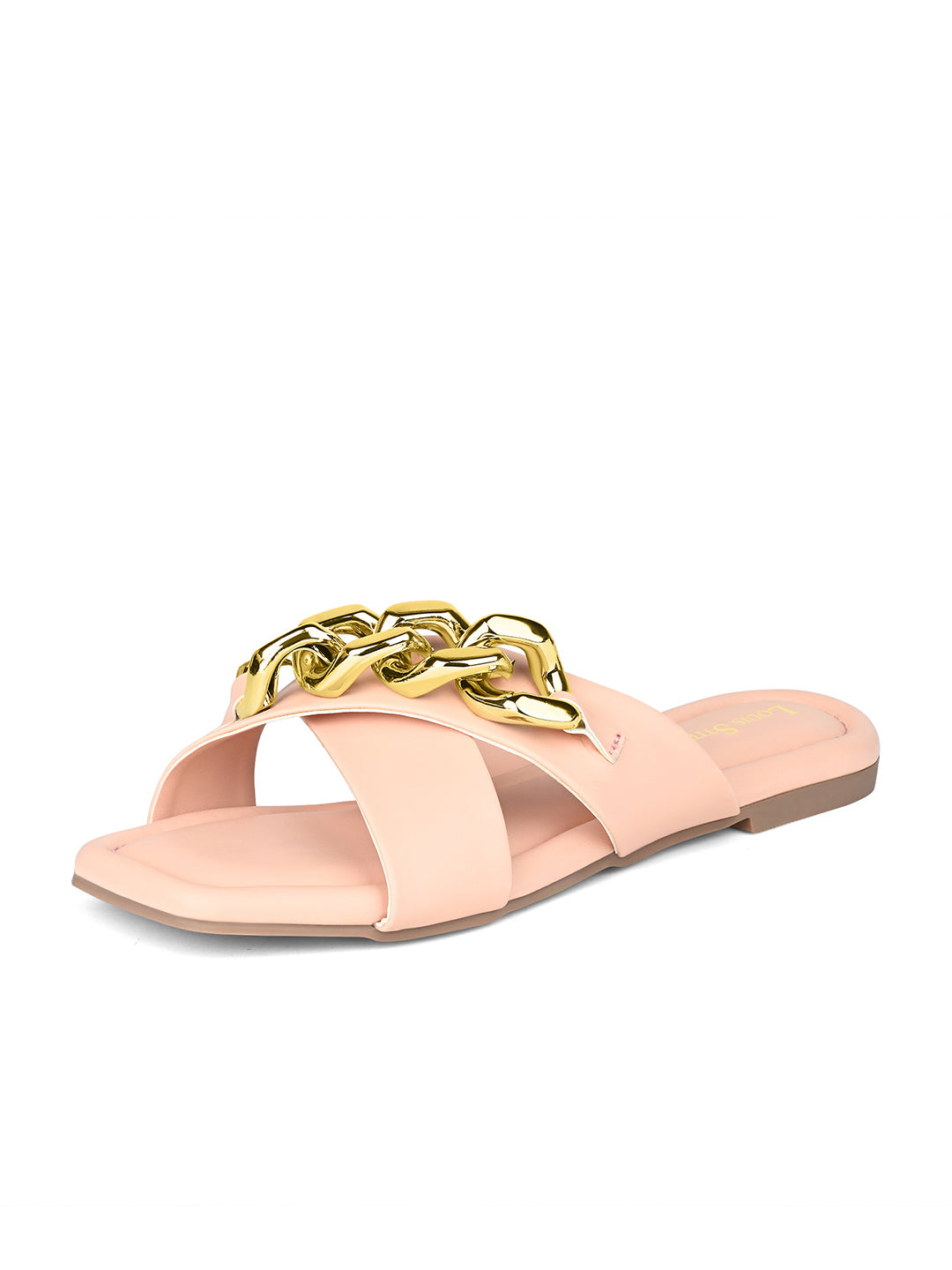 Peach Open Toe Flat Sandal for Women - This open-toe flat sandal is a stylish slip-on design, perfect for women seeking comfort and ease for everyday wear.