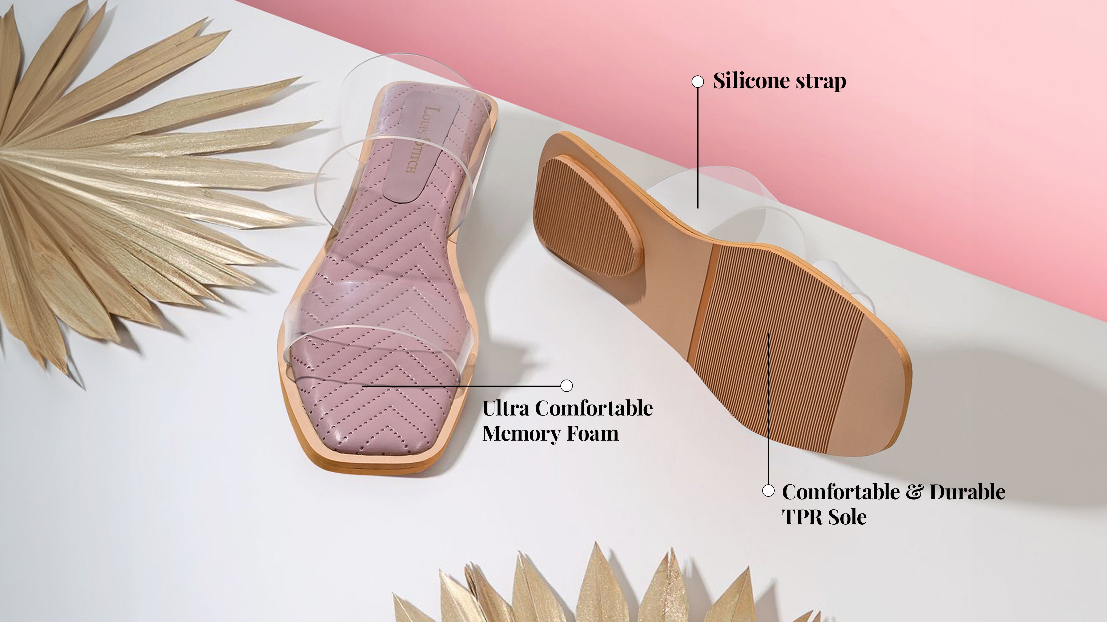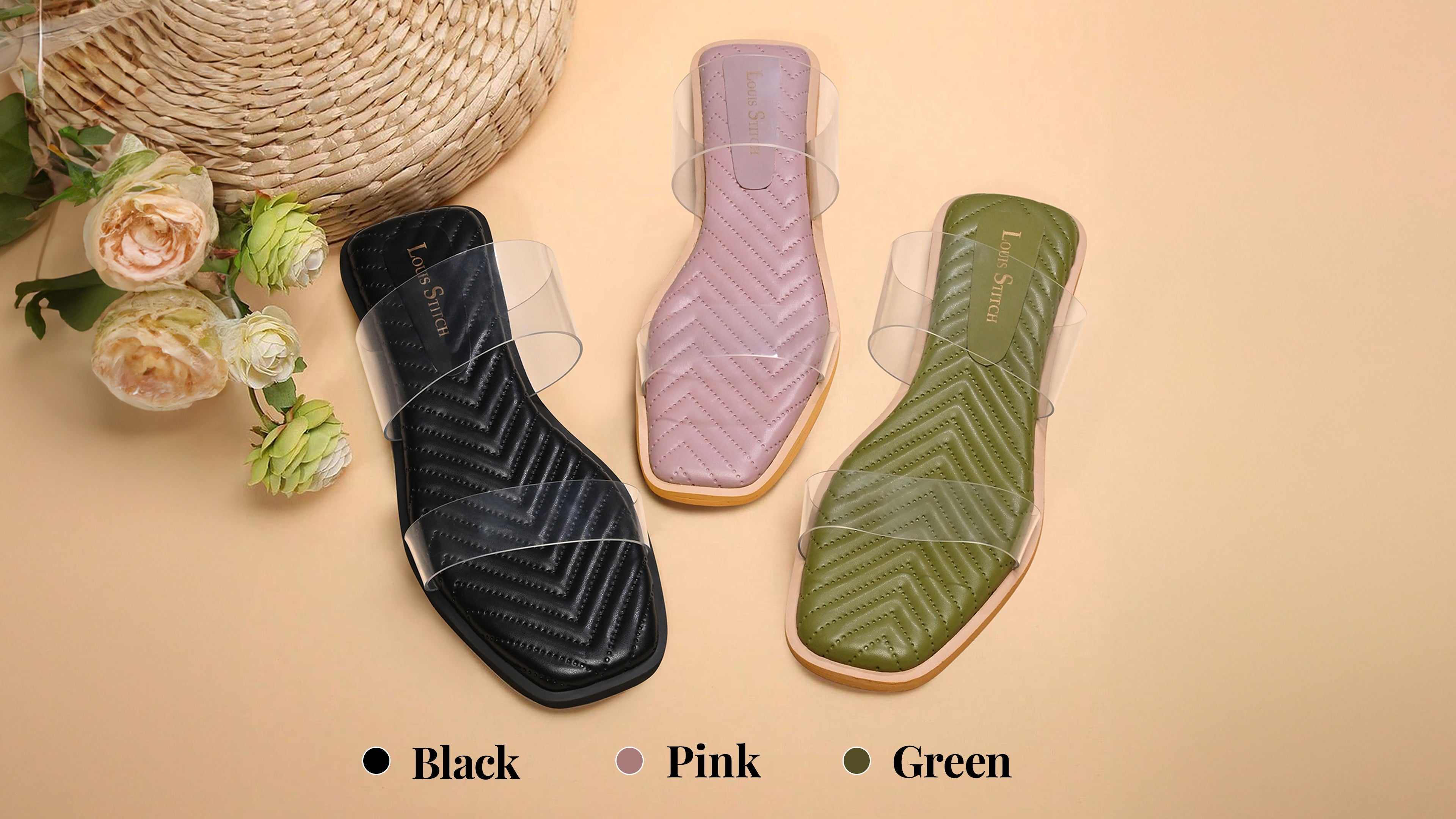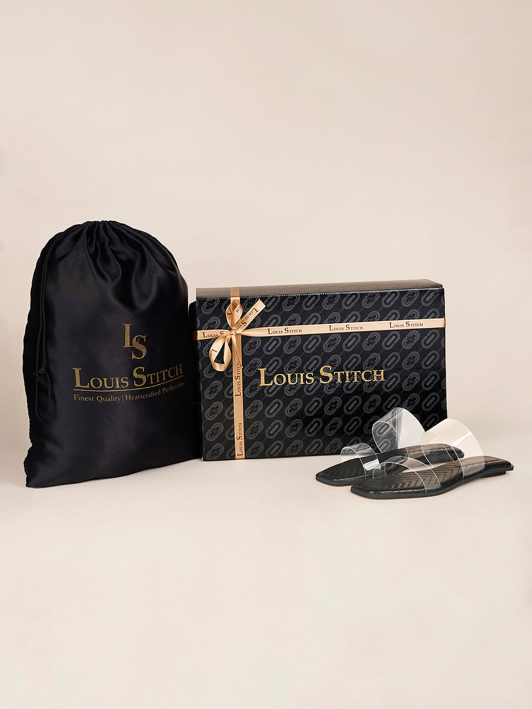Step up Louis Stitch's elegant flat sandals for Women. Crafted from durable materials, these sandals are perfect for any occasion - office wear, casual outings, or evening parties. The lightweight and high grade Resin Rubber sole ensures all-day comfort, while the transparent double-strap design adds a trendy touch.