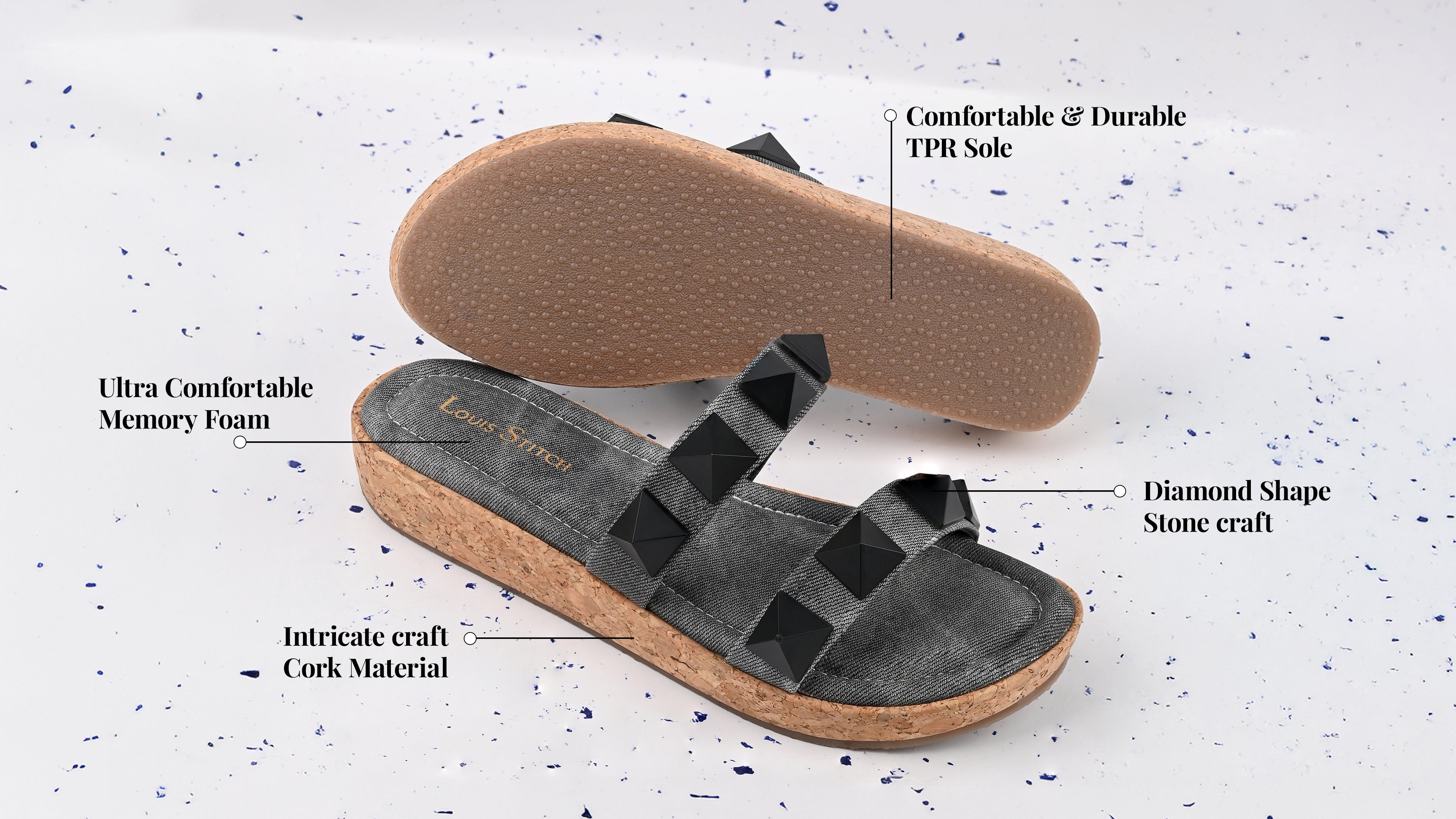 Discover the perfect blend of style and comfort with Louis Stitch two-strap diamond stone sandals. Designed to elevate any outfit, these sandals are ideal for both party wear and office settings. Crafted with high-quality material and a soft textile lining, they ensure durability while providing comfort.
